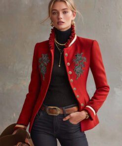 Ruffled Stand-up Collar Single-breasted Rose Embroidered Woolen Jacket