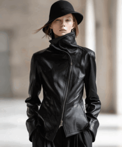 Personality And Fashion High Collar Oblique Zipper Black PU Jacket