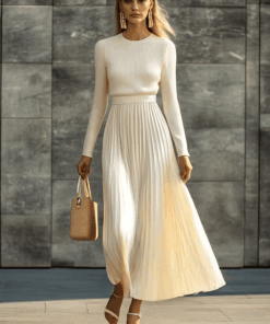 Elegant Casual And Comfortable Long-sleeved Cream Knitted Satin Pleated Hem Maxi Dress