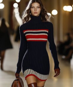 Retro French Elegant Fashionable High Collar Red And White Striped Dress