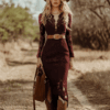 Vintage Bohemian Blue Lace Long Sleeve Midi Dress